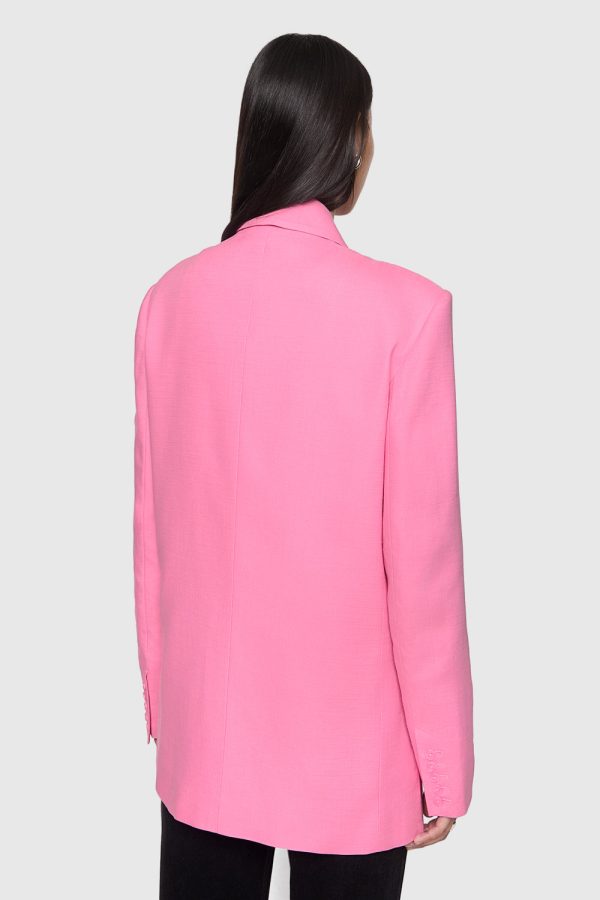 The Sam Oversized Blazer combines classic tailoring with a bold twist, featuring a pink hue, flap pockets, and angled welt detailing. Its fully lined shoulder pads offer a structured yet effortlessly cool look.